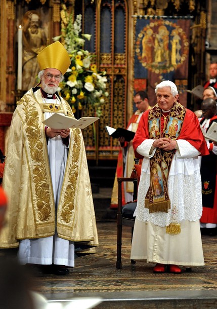 Más tarde, frente a los representantes de otras religiones, el Papa pronunció unas palabras sobre la necesidad de la reciprocidad para alcanzar un diálogo fecundo, pensando especialmente en “en la situación de algunas partes del mundo donde la colaboración y el diálogo interreligioso necesita del respeto recíproco, la libertad para poder practicar la propia religión y participar en actos públicos de culto, así como la libertad de seguir la propia conciencia sin sufrir ostracismo o persecución, incluso después de la conversión de una religión a otra”. Por otro lado, en visita de cortesía al arzobispo de Canterbury Rowan Williams, primado de la Comunión Anglicana, el Sucesor de Pedro, no queriendo hacer referencia a las dificultades del diálogo que son “bien conocidas por todos los presentes”, quiso dar gracias a Dios por la creciente amistad entre anglicanos y católicos y por el progreso en muchos ámbitos del diálogo. Al líder de una cada vez más dividida Comunión Anglicana, Benedicto XVI recordó que “fieles a la voluntad del Señor reconocemos que la Iglesia está llamada a ser inclusiva, pero nunca a expensas de la verdad cristiana. En esto radica el dilema que afrontan cuantos están sinceramente comprometidos con el camino ecuménico”. Era la primera vez que un Obispo de Roma visitaba el Lambeth Palace y se dirigía desde allí a los obispos anglicanos.