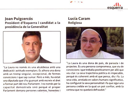 Todavía no me había repuesto del susto cuando un buen colaborador de Germinans Germinabit me hace llegar una revista de la formación independentista Esquerra Republicana de Catalunya en la comarca del Bages. Allí me quedo a cuadros cuando veo que en la publicación aparece otra conocida religiosa catalana (aunque de origen argentino) Sor Lucía Caram diciendo maravillas de la candidata de aquella comarca Laura Vilagrà, alcaldesa de Santpedor (el pueblo donde nació el entrenador Josep Guardiola) y candidata número 4 en la lista de Esquerra por Barcelona. En la publicación aparecen diversas personas pidiendo el voto para esa candidatura. La columna de Sor Lucía Caram está nada más y nada menos que al lado de la del Presidente del partido y candidato a la presidencia de la Generalitat Joan Puigcercós (tal como puede apreciarse en la foto).