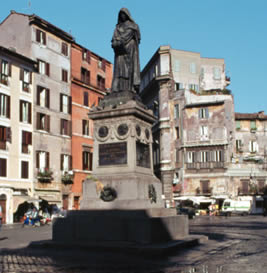 No es difícil para un turista que pasea por la ciudad de Roma acabar, antes o después, en la plaza de Campo dei Fiori, la plaza del mercado. No es una plaza de las más hermosas, ni se la puede comparar con las vecinas plaza Farnese o la impresionante plaza Navona con su obelisco, sus fuentes de Bernini, la Iglesia de Santa Inés de Borromini, etc. Sin embargo, la plaza de Campo dei Fiori, a pesar de estar rodeada de casas más bien sobrias y de aspecto austero, es una de las más populares entre los romanos. Y ello, además del mercado al aire libre de flores y alimentación (que causaría horror a los inspectores españoles de sanidad), sobre todo por una estatua que se halla en medio de la plaza.Se trata de un fraile encapuchado y lo curioso de dicha estatua es que fue erigida por el estado italiano laico en 1889, tras la conquista de Roma, por supuesto no por devoción a la vida religiosa y mucho menos a la Iglesia, sino todo lo contrario, precisamente como provocación a la Iglesia, como bien saben los romanos aún sin tener que leer las inscripción de la estatua en la que se rinde honor a dicho fraile “qui dove il rogo arse”, esto es, donde fue quemado por la inquisición. Y no es extraño ver de vez en cuando a los pies de la estatua coronas o ramos de flores de la gente que rinde homenaje al ajusticiado por la Iglesia.