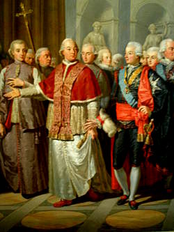 Tales sucesos constituirían el primer precedente de lo que había de llamarse en el s. XIX la cuestión romana, sobre la que ya se ha hablado en otros artículos de este blog. Después de haber cometido los generales franceses algunas violencias contra el Papa, Pío VI fue alejado por la fuerza de la Ciudad Eterna el 20 febrero de 1798, sustituyendo los soldados de Berthier a la guardia suiza, que fue licenciada al día siguiente. El anciano pontífice se preocupó antes de salir de Roma de que el colegio cardenalicio garantizase el gobierno de la Iglesia y, lleno de achaques y prácticamente moribundo, partió para Toscana, permaneciendo cerca de un año en las proximidades de Florencia. El gran Duque de Toscana, nombrado carcelero por el Directorio, obedeció por mera formalidad, pero intentó tratar a su huésped con la mayor deferencia posible.