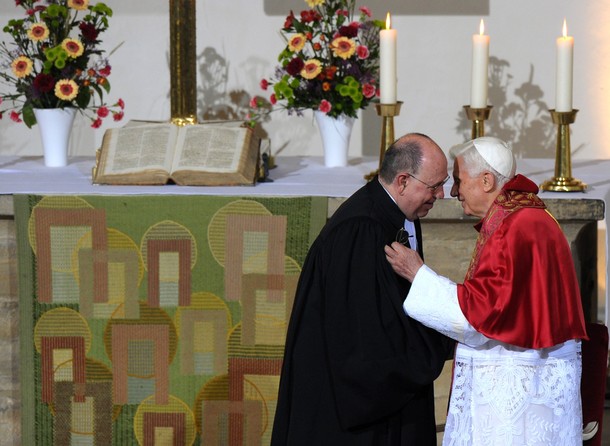 El presidente del Consejo de la Iglesia Evangélica Alemana, Nikolaus Schneider, ya había afirmado, en el discurso dirigido por la mañana al “querido hermano en Cristo” Benedicto XVI, que “sería una bendición” hacer posible, “en un tiempo no demasiado lejano”, la comunión eucarística común “a los creyentes que viven vínculos matrimoniales o familiares en los que se encuentran juntos confesiones diversas”. Concepto reiterado luego en una conferencia de prensa al mediodía, en la cual el pastor precisó que los protestantes plantean la cuestión ya “desde hace mucho tiempo” no sin suscitar algunas polémicas entre los hermanos católicos.