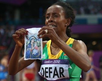 Primero, fue el jamaicano, Usain Bolt hijo del viento y de los mejores corredores de la historia deportiva mundial al llevar colgada en su hercúleo cuello, una cadena de oro con una medalla, y cuando se preparaba para la salida, se hizo la señal de la Cruz mirando y rezando hacia el Cielo.Segundo, fue la atleta etíope Meseret Defar quien protagonizó uno de los momentos más emotivos de las Olimpiadas de Londres 2012 cuando al cruzar la meta en la final femenina de los 5000 metros lisos y hacerse de la medalla de oro, sacó de su pecho una imagen de la Virgen María, la mostró a las cámaras y se la puso en el rostro en un momento de intensa oración.