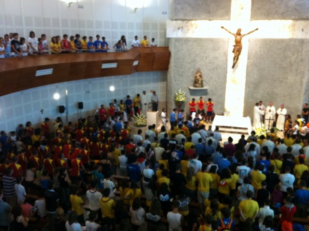 Hoy, en lugar de un obispo dos. El encargado de la catequesis fue Monseñor Giancarlo Vecerrica, obispo de Fabriano. Pero vinieron dos. Bendito sea Dios.Del aspecto del templo da buena razón la imagen. Tanta gente como ayer, si no es que había más. Un dato objetivo: cada día se están consagrando mil formas y apenas sobran. Por eso el título: estamos repartiendo casi mil comuniones diarias. A la hora de distribuir la eucaristía lo hacemos desde seis lugares que los voluntarios italianos señalan con banderas. Y necesitamos nuestro tiempo.