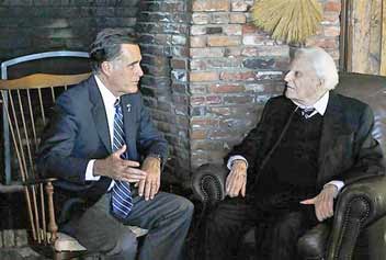Reunión con Billy GrahamEl camino de acercamiento a los evangélicos podría estar dándole resultados a Romney justo en el momento más importante de la campaña. Hace unos días, Billy Graham recibió al candidato republicano en su casa, un encuentro que se reflejó en todos los medios de comunicación nacionales.