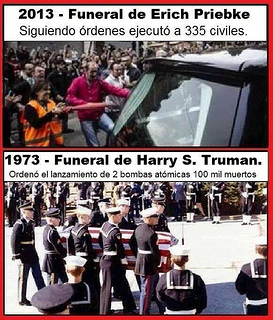 Pero hace unos días, en un rincón de Italia murió a los 100 años de edad Erich Priebke, un católico alemán que había participado bajo órdenes de guerra -ajustadas a las leyes vigentes- como capitán de las SS nazis, de la matanza de 335 personas, a sus 31 años. Por ese hecho fue extraditado hace 15 años de la cuidad argentina de Bariloche (donde se lo reconoció como vecino ejemplar), para ser juzgado en Italia -pese a tratarse de actos prescriptos-, donde quedó en prisión hasta ahora. En su video-testamento, llegó a decir