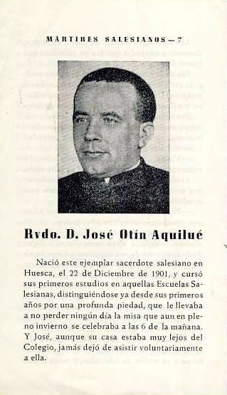 Profeso desde 1920 y sacerdote desde 1928, José Otín Aquilué era director en funciones del colegio salesiano de Alcoy (Alicante) al estallar la guerra, donde sufrió los registros de los días 20,21 y 22 de julio de 1936, el arresto de la comunidad religiosa y la incautación de la casa. Llevados los religiosos a la sede del comité y al ayuntamiento, al saber el alcalde que no habían hallado armas en el colegio, mandó que les dieran salvoconductos. Se acogieron al refugio del Hotel Continental, para dispersarse el día 23. Otín marchó a casa de otro salesiano en Valencia, donde llevó vida de oración, y oía confesiones. A finales de noviembre, el otro salesiano fue detenido y Otín marchó a una fonda, donde fue reconocido por alguien que lo denunció, desapareciendo a continuación.
