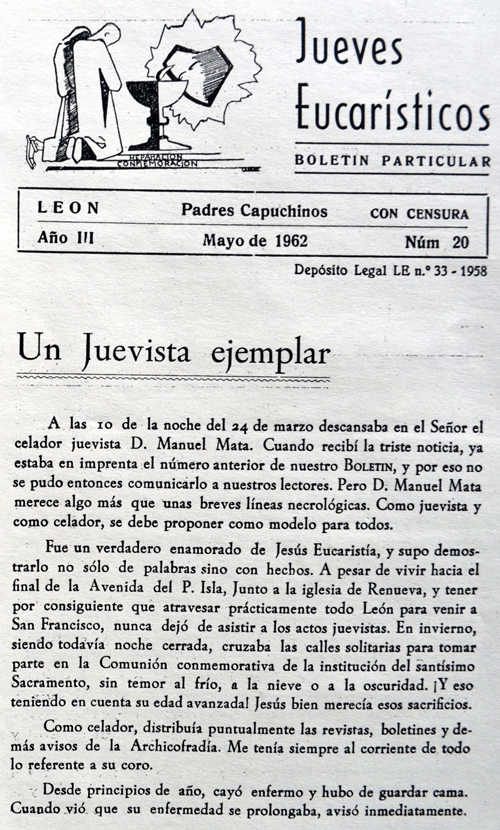 A falta de otros datos, el de la estampa de que este joven iba a diario a misa de 6 de la mañana en su Huesca natal, nos habla de su temprano (por edad y por la hora) ejercicio de la reciedumbre. Todos los Santos es una fiesta para recordar que son muchos más los que van al Cielo que aquellos a los que se ha podido beatificar, así que a título personal y familiar -y por estar dedicada esta entrada a un paisano suyo- me permito aportar un recuerdo de la fe recia de otro oscense, mi abuelo Manuel Mata Fierro, que conocí al regreso de la beatificación de Tarragona, cuando mi primo José María me dio la siguiente necrológica publicada en una hoja parroquial: