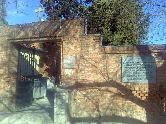 Aunque hasta ahora mi norma ha sido traer el recuerdo de mártires muertos o nacidos el día en que escribo, al toparme ayer con esa placa me pareció lógico hablar de estos carmelitas fusilados el 18 de agosto de 1936 en la tapia del cementerio parroquial de San Sebastián mártir, conocido como Cementerio de Carabanchel Bajo o de San Sebastián, junto a la Ermita de Nuestra Señora de la Antigua; la más antigua (valga la redundancia) de Madrid, donde rezaba san Isidro labrador. Aunque la placa dice haberse puesto hacia 1961, por su aspecto es obvio que ha sido renovada.