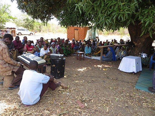 La misa fue debajo de uno de estos árboles, muy bien participada. La gente se sienta en el suelo.
