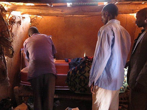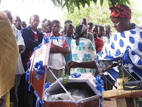 A final de la misa, antes de ir al entierro, pasan todos y cada uno de los presentes a despedir al difunto. Pasan primero las mujeres y luego los hombres, y rocían el cuerpo con agua bendita, mientras el coro canta. Es un momento muy emocionante.