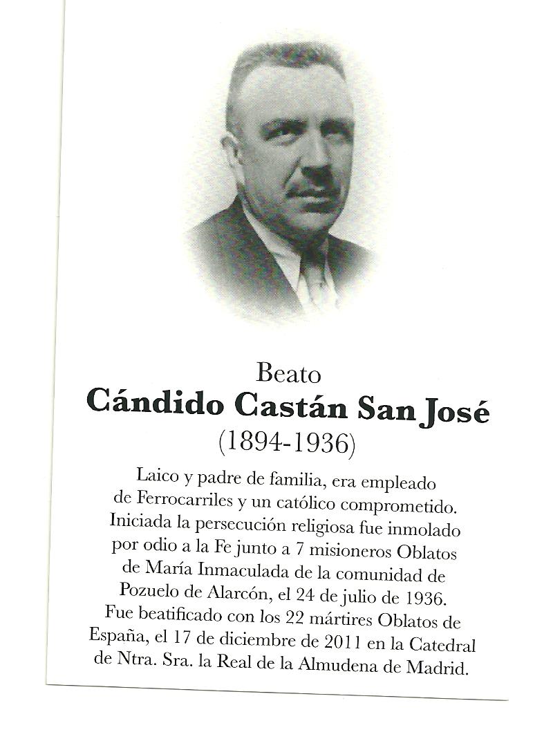 Castán, natural de Benifayó (Valencia), se había casado con Francisca Guiral Sorlí (tuvieron un hijo y una hija) en 1919, año en que fue elegido vicepresidente del comité federativo de los Sindicatos católicos de obreros, que presidió entre 1924 y 1928. También presidió a los ferroviarios católicos, sección Madrid-Norte. Junto con otros residentes de la Colonia de San José de Pozuelo, contribuyó a fundar la Capilla de Nuestra Señora de las Angustias en la Calle del Plantío. Durante la Dictadura fue miembro de la Unión Patriótica, nombrado en 1925 concejal suplente del Ayuntamiento de Madrid y en 1927, concejal jurado del distrito Centro-Hospicio y miembro de la Asamblea Nacional Corporativa. Compartió puesto con el socialista Andrés Saborit en la subcomisión de Propaganda de la Organización Corporativa Nacional (1927), pasando en 1930 al Consejo de Trabajo. El 12 de junio de 1933 fue elegido consejero Auxiliar de Renovación Española (el partido de Calvo Sotelo, no era, por tanto, carlista, aunque Jambrina lo afirma por error). Su domicilio ya había sido registrado el 18 de julio por milicianos, que el 19 entraban en el convento-seminario donde se instalarían el día 22, arrestando a los 38 oblatos en el comedor (de 4 por 5,50 metros). Castán fue arrestado a mediodía del 23 en su casa por “milicianos del comité revolucionario de Pozuelo”, en presencia solo de su hija, que relataría: