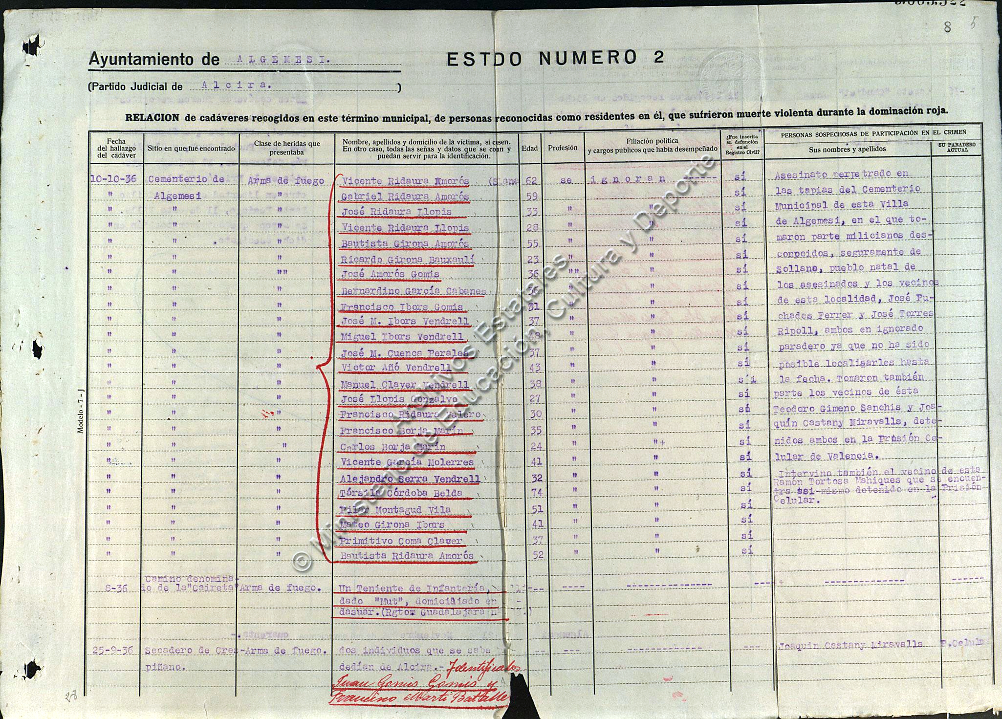 Como puede verse en la imagen, la documentación de la Causa general (legajo 1370, expediente 1, folio 8) fecha el 10 de octubre el asesinato de 25 personas, entre las que se cuenta Társila Córdoba, asegurando que en él “tomaron parte milicianos desconocidos, seguramente de Sollana, pueblo natal de los asesinados, y los vecinos de esta localidad José Puchades Ferrer y José Torres Ripoll", fugados, más Teodoro Gimeno Sanchis, Joaquín Castany Miravalls y Ramón Tortosa Mahiques, detenidos.