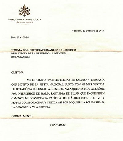 «Cristina: me es grato hacerte llegar mi saludo y cercanía con motivo de la fiesta nacional, junto con mi más sentida felicitación a todos los argentino [sic], para quienes pido al Señor, por intercesión de María Santísima de Luján, que encuentren caminos de convivencia pacífica, de diálogo constructivo y mutua colaboración, y crezca así por doquier la solidaridad, la concordia y la justicia».