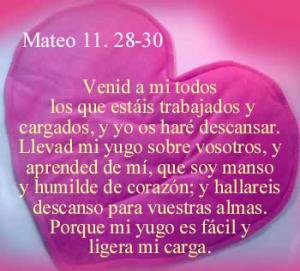 “Venid a mí todos los que estáis fatigados y sobrecargados, y yo os daré descanso. Tomad sobre vosotros mi yugo, y aprended de mí, que soy manso y humilde de corazón; y hallaréis descanso para vuestras almas. Porque mi yugo es suave y mi carga ligera.”