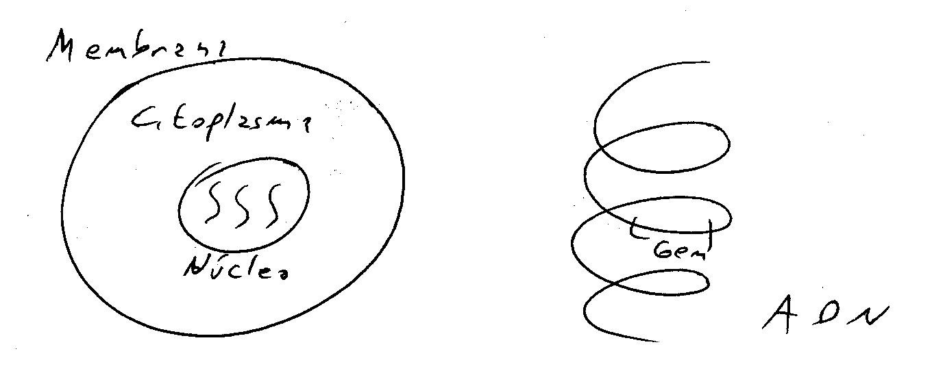 No estaría de más hacer un pequeño dibujo para dar una idea más acabada acerca del modo en que se transmite la información genética. Los seres vivos están compuestos por células; éstas a su vez tienen una membrana, un citoplasma y un núcleo. Dentro del núcleo hay unos corpúsculos llamados cromosomas. Estos cromosomas están formados por una substancia llamada ácido desoxirribonucleico, o ADN. Este ADN es una gigantesca macromolécula gigantesca en términos moleculares) de varios millones de peso atómico, de forma espiralada; una doble hélice, cuyos tramos se denominan genes. Estos genes contendrían toda la información necesaria para, a partir de una única célula original o huevo, generar al individuo completo.