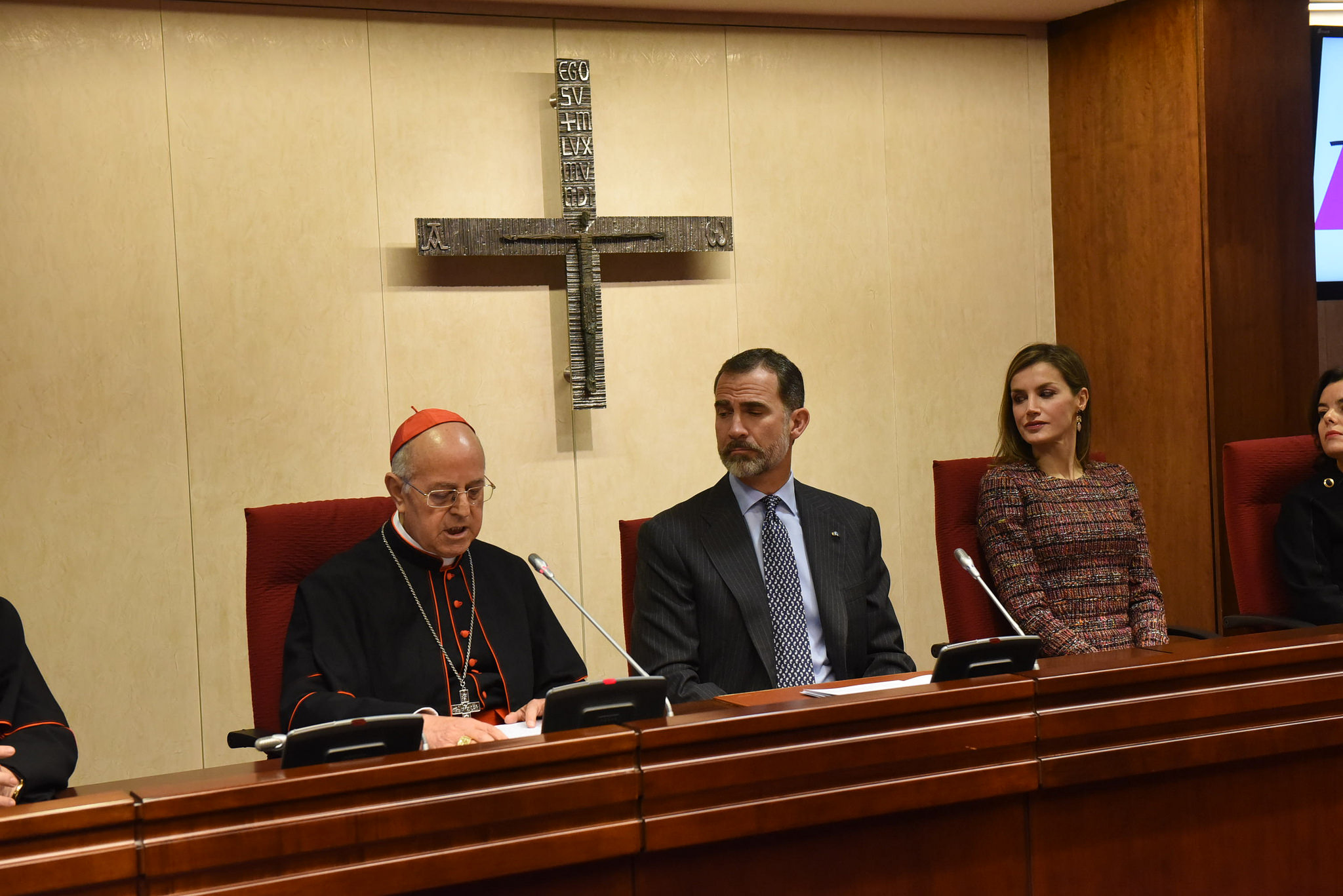 Majestades, son bienvenidos a la Conferencia Episcopal Española. Ante Uds. en esta situación excepcional, (en otra semejante el día 21 de noviembre de 2001 tuvimos la oportunidad de recibir a los Reyes D. Juan Carlos y Dña. Sofía), deseamos, al hacer memoria de nuestra historia, manifestar nuestro compromiso de cumplir con fidelidad nuestra misión que incluye también el servicio a nuestro pueblo. Pedimos a Dios que bendiga a la Familia Real. ¡Muchas gracias!