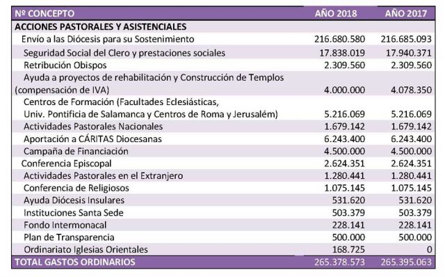 - Plan de trasparencia. Se habilita esta partida, que anteriormente estaba incluida en las campañas de financiación, para atender a los distintos programas del Plan de Trasparencia aprobado por la Conferencia Episcopal.