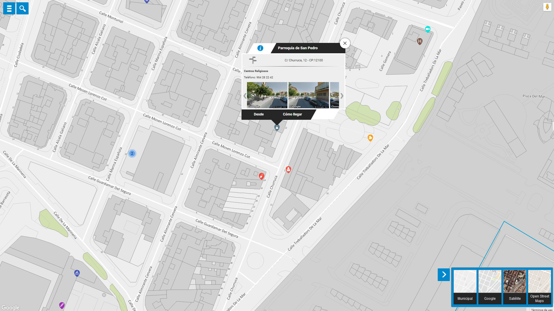El Ayuntamiento de Castellón dispone de un servicio denominado Geoportal, que viene a ser un localizador que contiene información “georreferenciada” de diversos servicios o edificios de la ciudad, tales como farmacias, esculturas, parkings, centros comerciales, edificios públicos o lugares para el servicio municipal de bicicletas, y también sobre las iglesias de la ciudad.