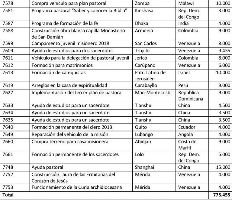 Monasterios e institutos religiosos 14 98.000 12,64 Sacerdotes 17 98.955 12,76 Seminarios 0 0 0,00 Vehículos 8 67.000 8,64 Total general 106 775.455 100,00