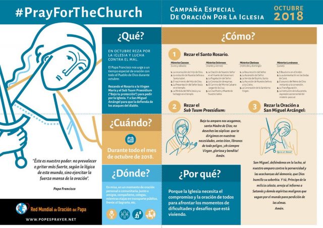 El mes de octubre es el mes del Rosario y el papa Francisco nos invita a rezarlo cada día para pedir a la Virgen y el Arcángel Miguel que proteja “a la Iglesia del diablo, que siempre trata de dividirnos de Dios y entre sí”. La Red Mundial de Oración del Papa ya ha puesto en marcha una campaña que se extenderá durante todo el mes de octubre en los 98 países donde está presente.