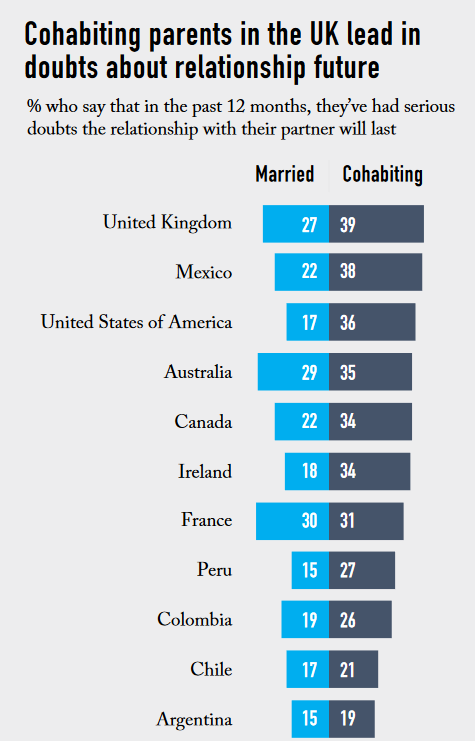 “En toda la angloesfera, los padres perciben que la cohabitación es marcadamente menos estable que el matrimonio”, destaca el informe.