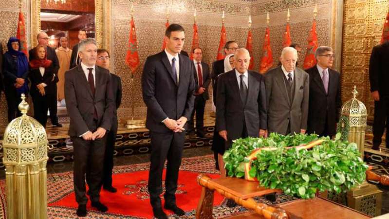 Para su primer viaje oficial al extranjero tras ganar la moción de censura, Sánchez eligió el reino de Mohamed VI, en noviembre de 2018. Le acompañó el ministro Fernando Grande-Marlaska.No viajaban ministras, pero las mujeres de la delegación española llevaron velo durante la visita al mausoleo del rey Mohamed V. Y ellos, el presidente y el ministro del Interior, se descalzaron.