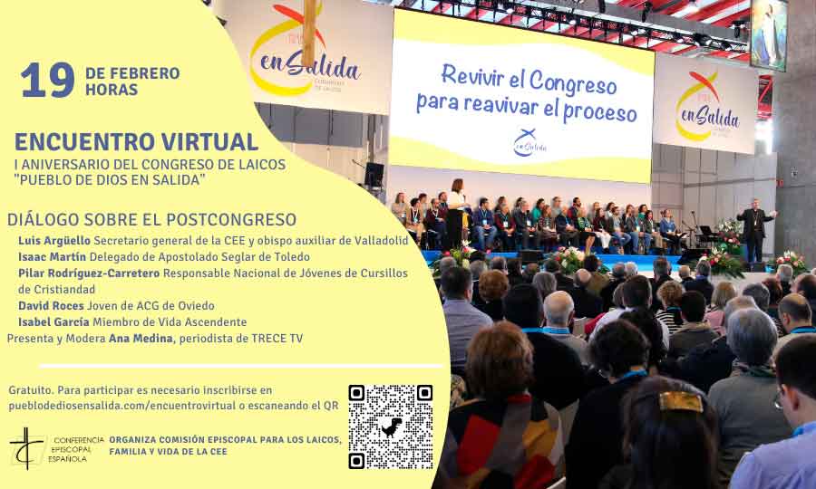 Por ello la Comisión Episcopal de Laicos, Familia y Vida de la CEE organiza un encuentro virtual con el título “Revivir el Congreso para reavivar el proceso” para el viernes 19 de febrero. En este acto participará el Secretario General de la CEE, Mons. Luis Argüello.