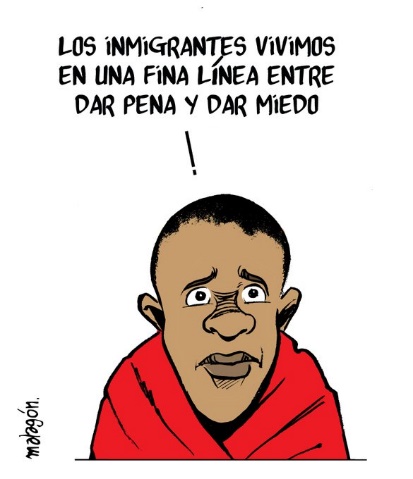 Como dice el ilustrador los migrantes, da igual de donde procedan, pueden dar pena y dar miedo, porque para muchos ciudadanos su presencia hace que aparezcan en la sociedad prejuicios hacia ellos, con actitudes de desconfianza, inquietud e inseguridad, incluso xenófobas. Pero la mayoría de los extranjeros que vienen desesperados y sin recursos tienen familia en sus países y se juegan la vida buscando un futuro mejor que el que tienen, para ellos y para los suyos, pero en muchos casos, este futuro no es real, es un engaño, y todavía el drama se agudiza cuando se les trata mal como delincuentes.