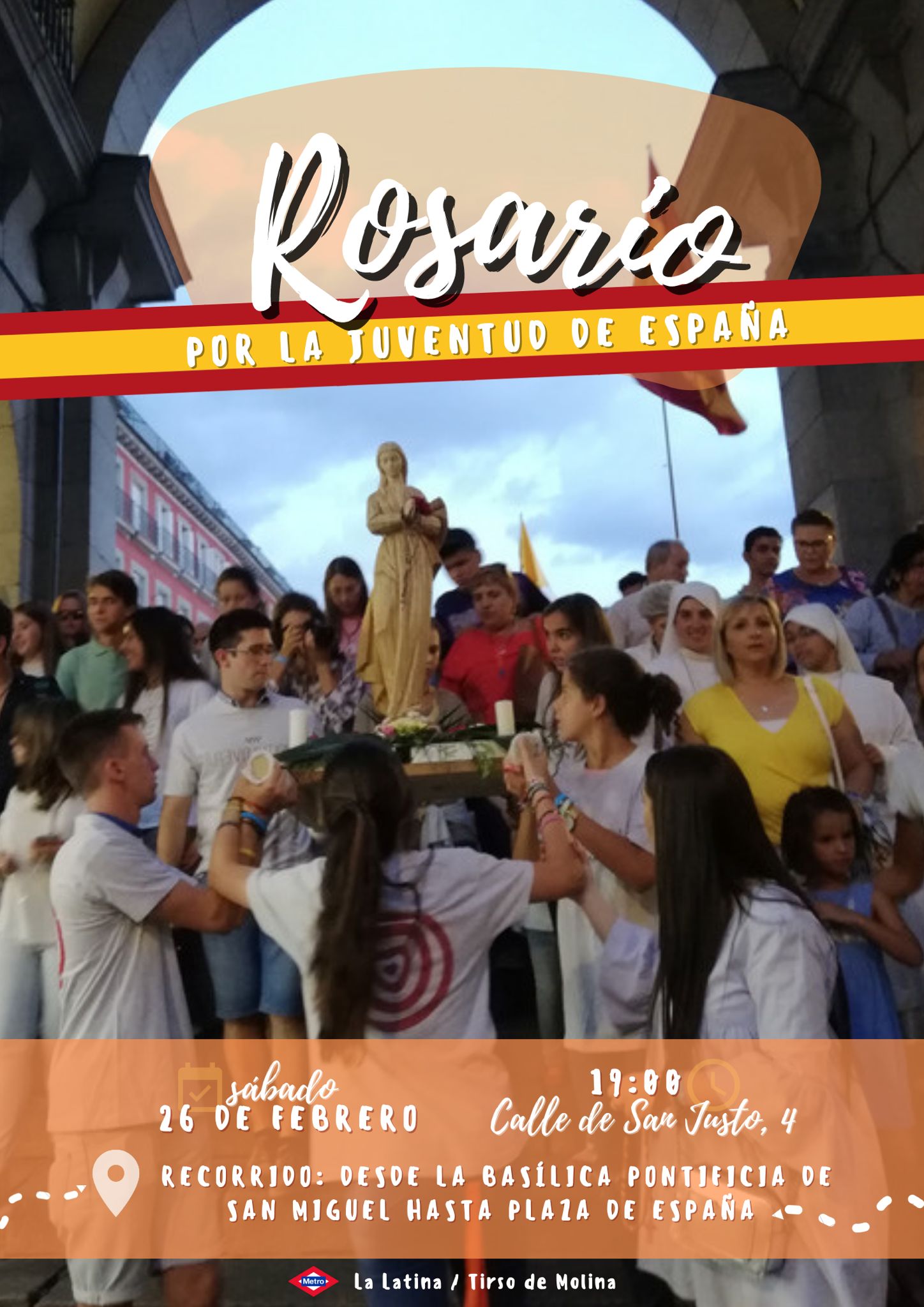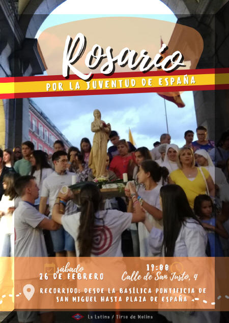 El sábado 26 de febrero se reunirán jóvenes católicos de toda España a las 19 horas para rezar el Rosario, en el centro de la ciudad de Madrid, y pedir por la juventud del país. Comenzará en la Basílica Pontificia de San Miguel hasta Plaza de España.