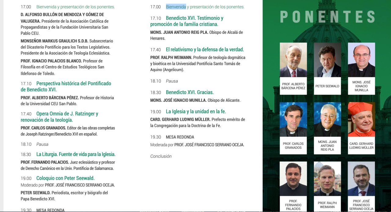 Además, se celebrará un coloquio con Peter Seewald, periodista, escritor y biógrafo del Papa Benedicto XVI que será moderado por el colaborador de Religión Confidencial el profesor José Francisco Serrano Oceja.