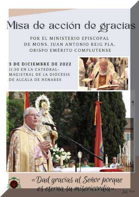 Mañana sábado 3 de diciembre el obispo emérito de la diócesis de Alcalá de Henares, Mons. Juan Antonio Reig Pla presidirá a las 11.30h, en la catedral magistral de su diócesis, una misa de acción de gracias por el ministerio episcopal.