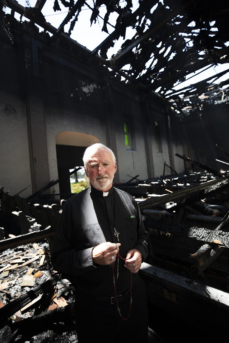 David O'Connell en una parroquia de la Misión de San Gabriel destruida por un incendio.