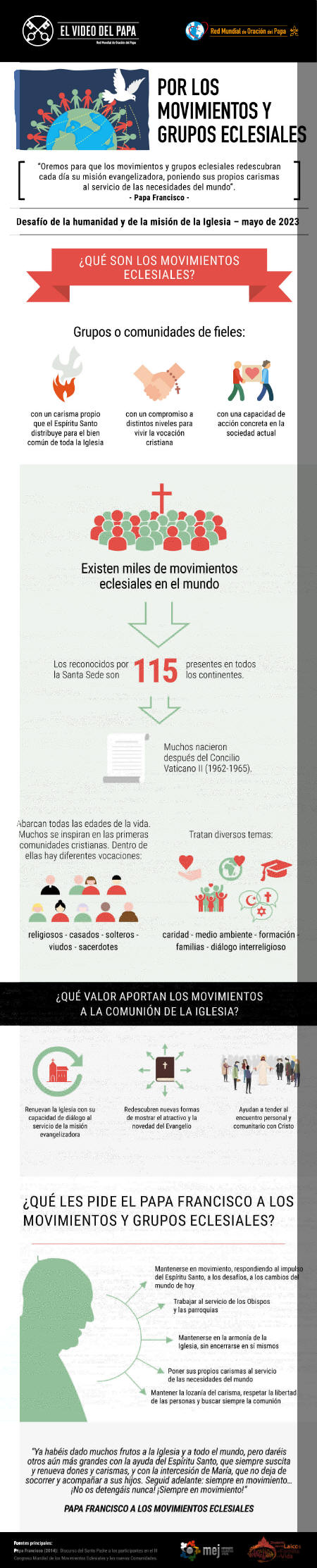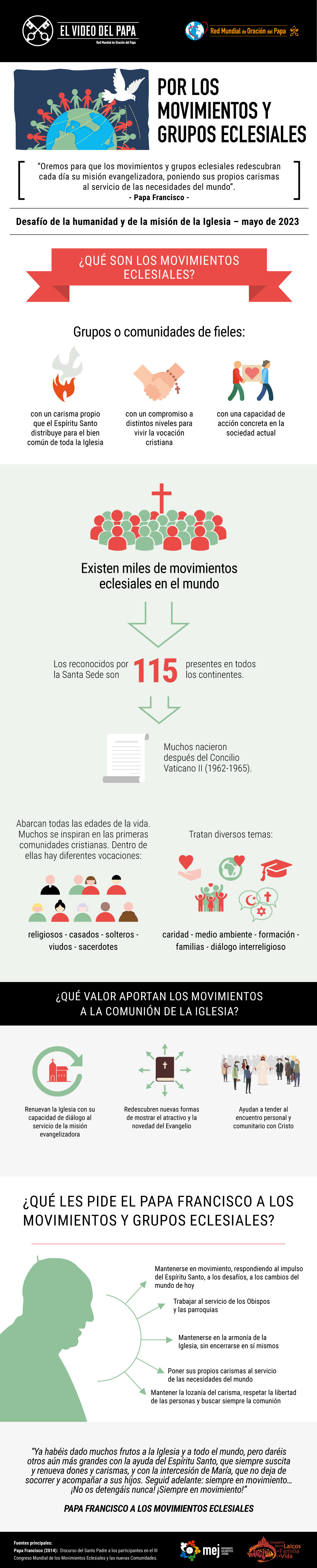 El P. Frédéric Fornos S.J., Director Internacional de la Red Mundial de Oración del Papa, comentó acerca de esta intención: “De alguna manera, Francisco se detiene en una nota fundamental de estos movimientos eclesiales: que sigan en movimiento. Que sigan ‘respondiendo al impulso del Espíritu Santo, a los desafíos, a los cambios del mundo de hoy’, que sigan despertando, según su propio carisma, ‘la misión evangelizadora de la Iglesia de tantos laicos comprometidos en vivir y testimoniar el Evangelio en las realidades ordinarias de la vida, en el trabajo, en el mundo educativo, social, cultural’.