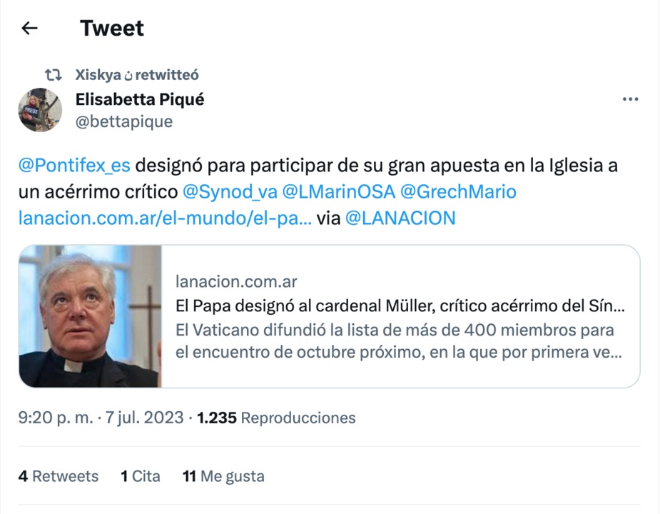 Curiosamente, estas dos mujeres han retuiteado un tweet de la periodista argentina, Elisabetta Piqué, corresponsal de La Nación en el Vaticano, en el que decía: "El Papa designó para participar de su gran apuesta en la Iglesia a un acérrimo crítico del Sínodo" (en referencia al cardenal Müller).