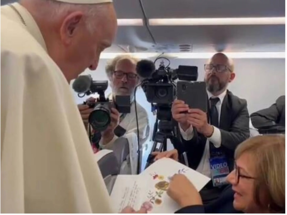 El Sumo Pontífice recibió en el vuelo a la JMJ una “cruz florecida” dibujada por el joven