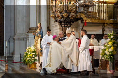 El palio arzobispal que hoy se le ha impuesto fue bendecido por el Papa Francisco en la Eucaristía celebrada en la Basílica de San Pedro, en Roma, el pasado 29 de junio, Solemnidad de San Pedro y San Pablo. Mons. Gil Tamayo, junto a otros arzobispos metropolitanos nombrados en el último año –entre ellos otros tres españoles-, recibió este palio bendecido de manos del Papa, durante dicha Eucaristía en Roma.