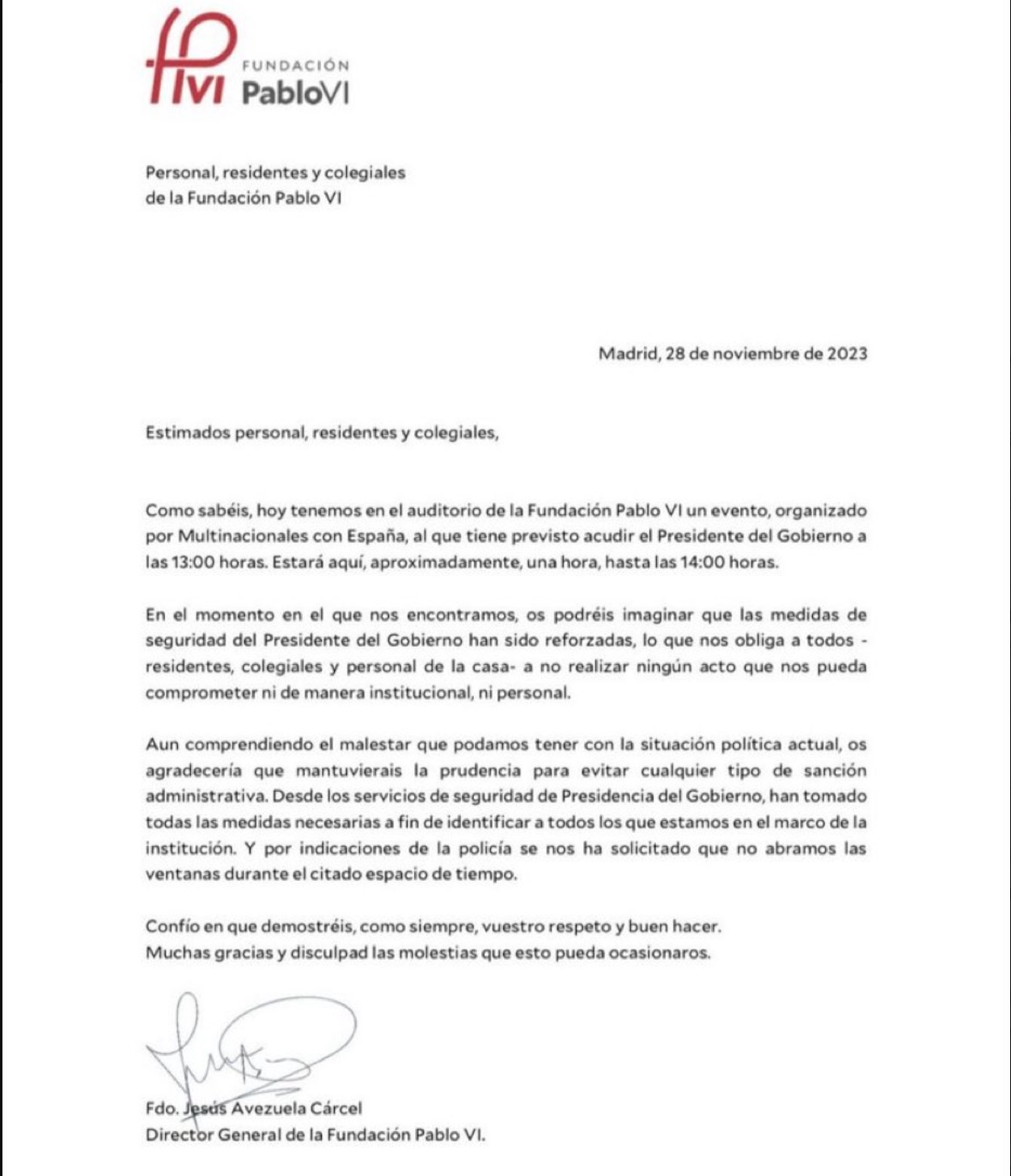 Carta del director general de la Fundación Pablo VI.