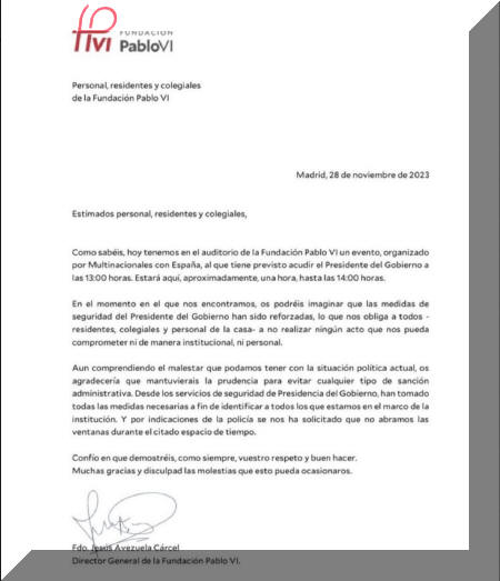 El director general de la Fundación Pablo VI, Jesús Avezuela, (que no era el responsable del acto) había advertido en una carta al personal, residentes y colegiales del colegio Mayor Pio XII (centro que se enmarca dentro de las obras sociales de la Fundación Pablo VI) que "tuvieran la prudencia para evitar cualquier tipo de sanción administrativa. Desde los servicios de seguridad de presidencia de Gobierno, han tomado todas las medidas necesarias a fin de identificar a todos los que estamos en el marco de la institución. Y por indicaciones de la policía, se nos ha solicitado que no abramos las ventanas durante el citado espacio de tiempo".