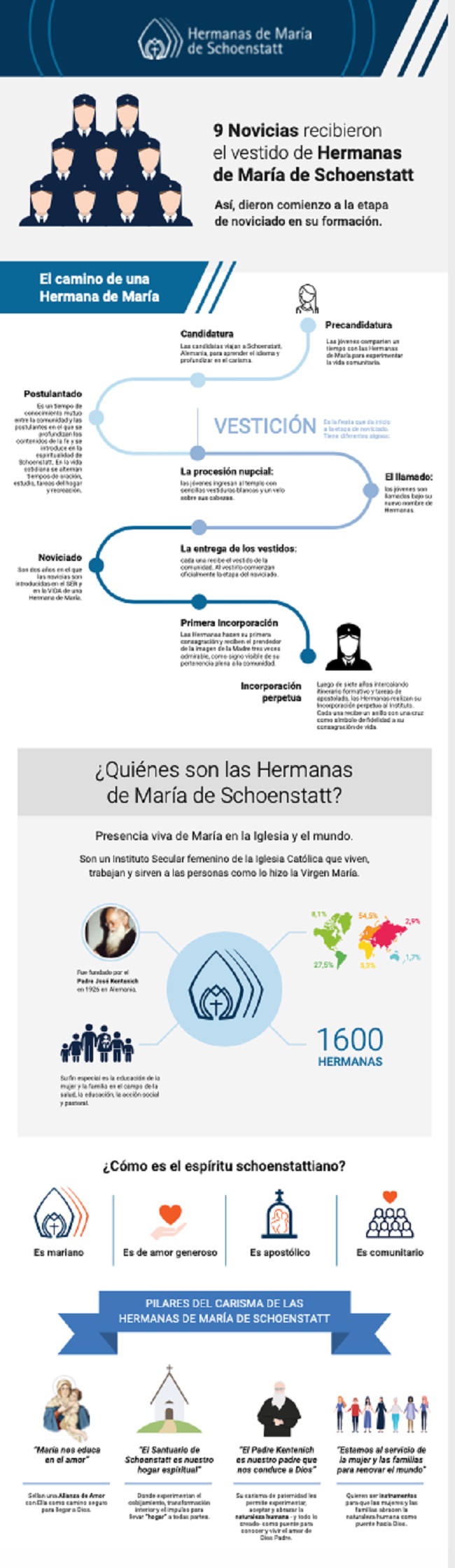 Las Hermanas de María de Schoenstatt son una comunidad que busca hacer presente a la Virgen María como instrumento de la gracia de Dios en y desde el corazón de la Iglesia, y así mantener el mundo abierto para Dios. Con una misión especial, sobre todo con la educación de las mujeres y las familias, quieren transmitir el amor fecundo de María inspiradas en su actitud de pureza y de servicio.