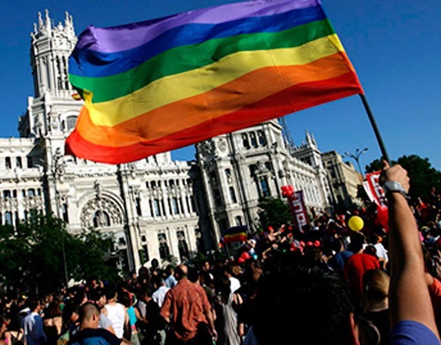 Bandera del orgullo gay en el Ayuntamiento de Madrid.