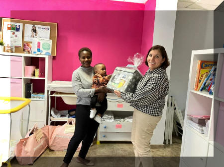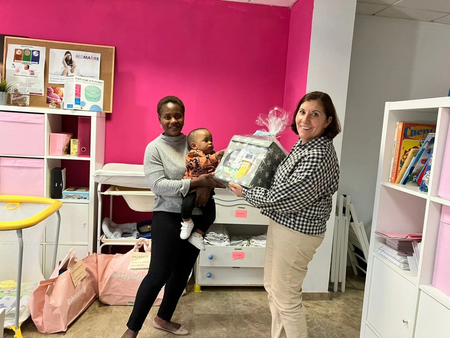Una voluntaria entrega una canastilla a una madre de RedMadre.