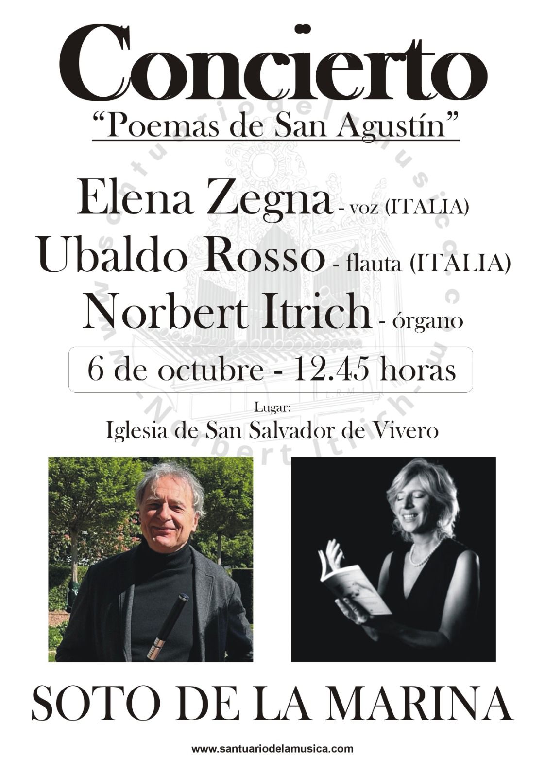 La flauta del maestro italiano Ubaldo Rosso y el órgano de Norbert Itrich sonarán en el concierto titulado `Poemas de San Agustín´. Estarán acompañados por la lectura en español de poemas de San Agustín, a cargo de la actriz italiana Elena Zegna. Será una gran oportunidad de disfrutar de música clásica de primer nivel internacional. La entrada será gratis, con colaboración económica voluntaria.