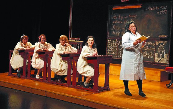 Por ello de la novela, la primera producción de Tanttaka Teatro puso el acento en el género masculino de la historia, que se desarrolla en aquella escuela mixta donde ellos los alumnos estaban juntos, en el edificio; pero separados por sexos, en las aulas. Las chicas estaban destinadas al matrimonio. Por ello sus labores era materia primordial. Pues una mujer casada, con muchos hijos, era sinónimo de triunfo, para el régimen.