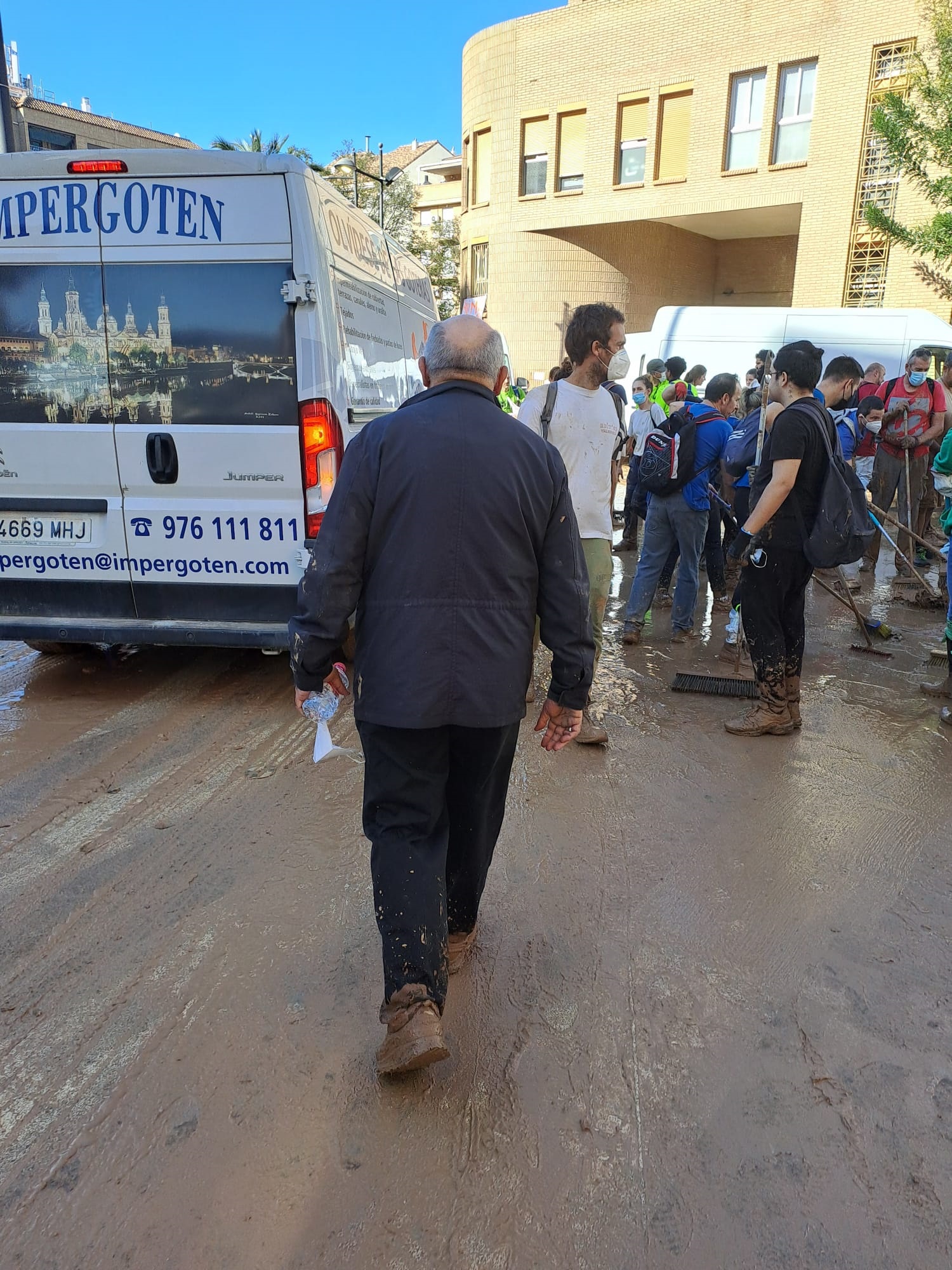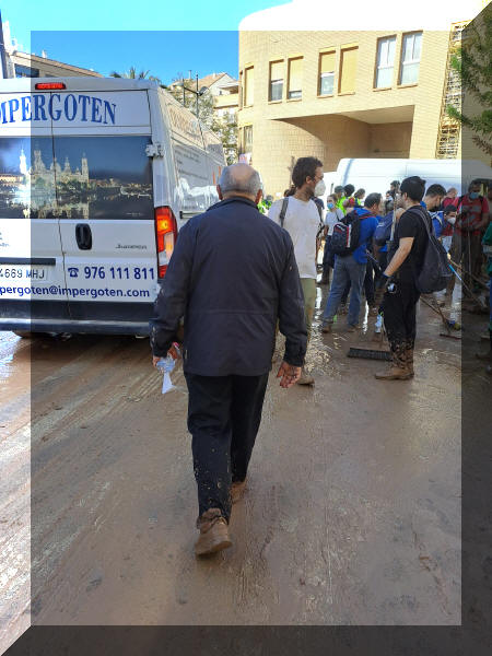 Enrique Benavent manchado de barro con vecinos de Aldaia.