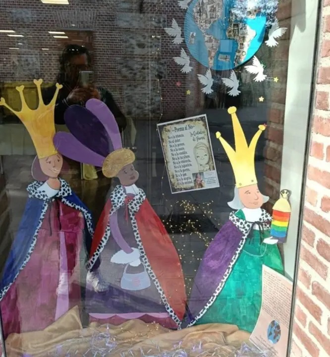 Por su parte, en la biblioteca municipal de Fernando de Henares (Madrid) colocaron como decoración un dibujo de tres reinas magas con una bandera LGTB.